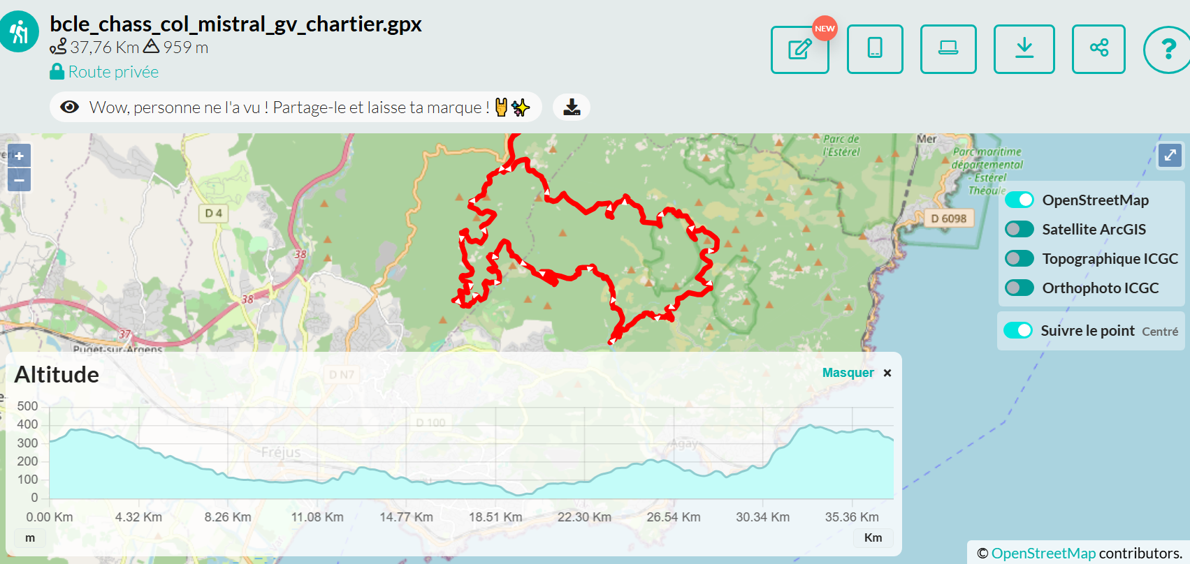 Parcours de 38 kms et 959 m de Dénivelé positif cumulé et environs 3h30. Une boucle un peu plus longue pour vététistes, offrant rapidement des jolies vues mer de Agay aux Issambres sur pistes légèrement techniques et parfois abîmées par les pluies avec passage dans les collines de Saint Raphaël et un retour dans une partie des gorges du Perthus.